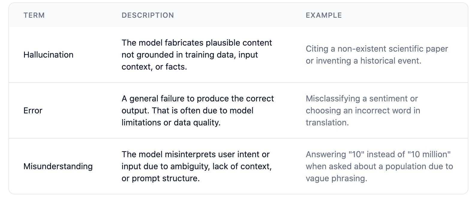 It is essential to differentiate between hallucination, factual error, and model misunderstanding. That is more important to know, more particularly in the context of large language models (LLMs) and other generative systems.